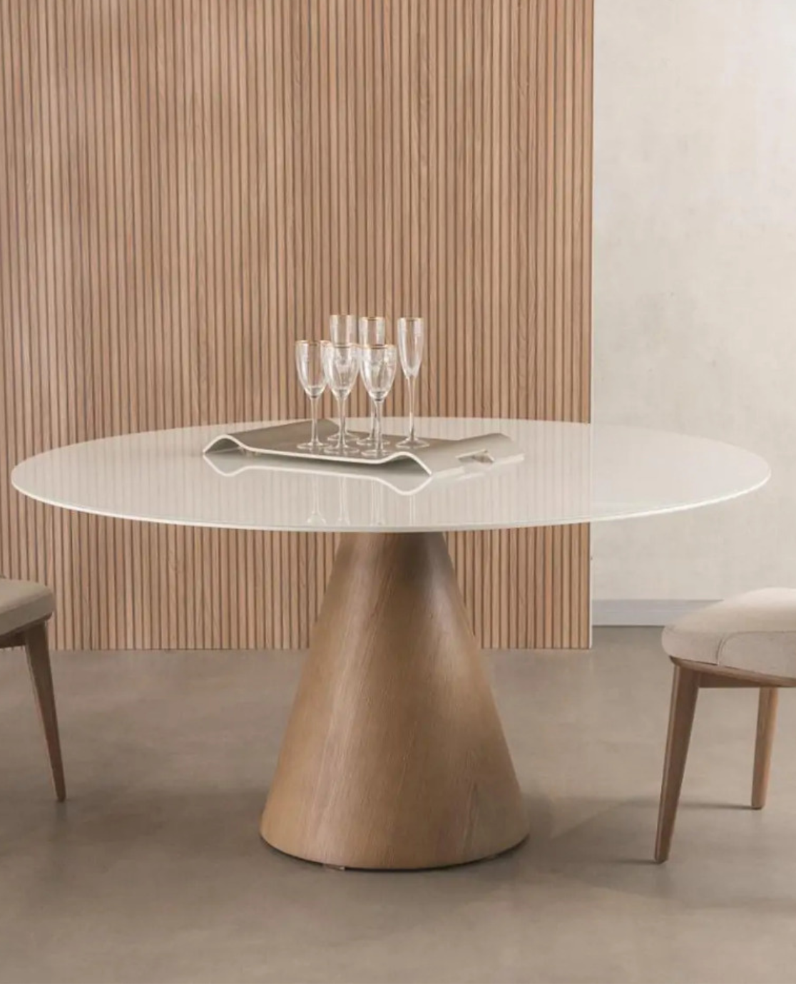 Featuring a sleek, glossy lacquer top and a wooden base with a glass insert, the Mila Dining Table offers a sophisticated and tasteful design that exudes elegance and exclusivity.