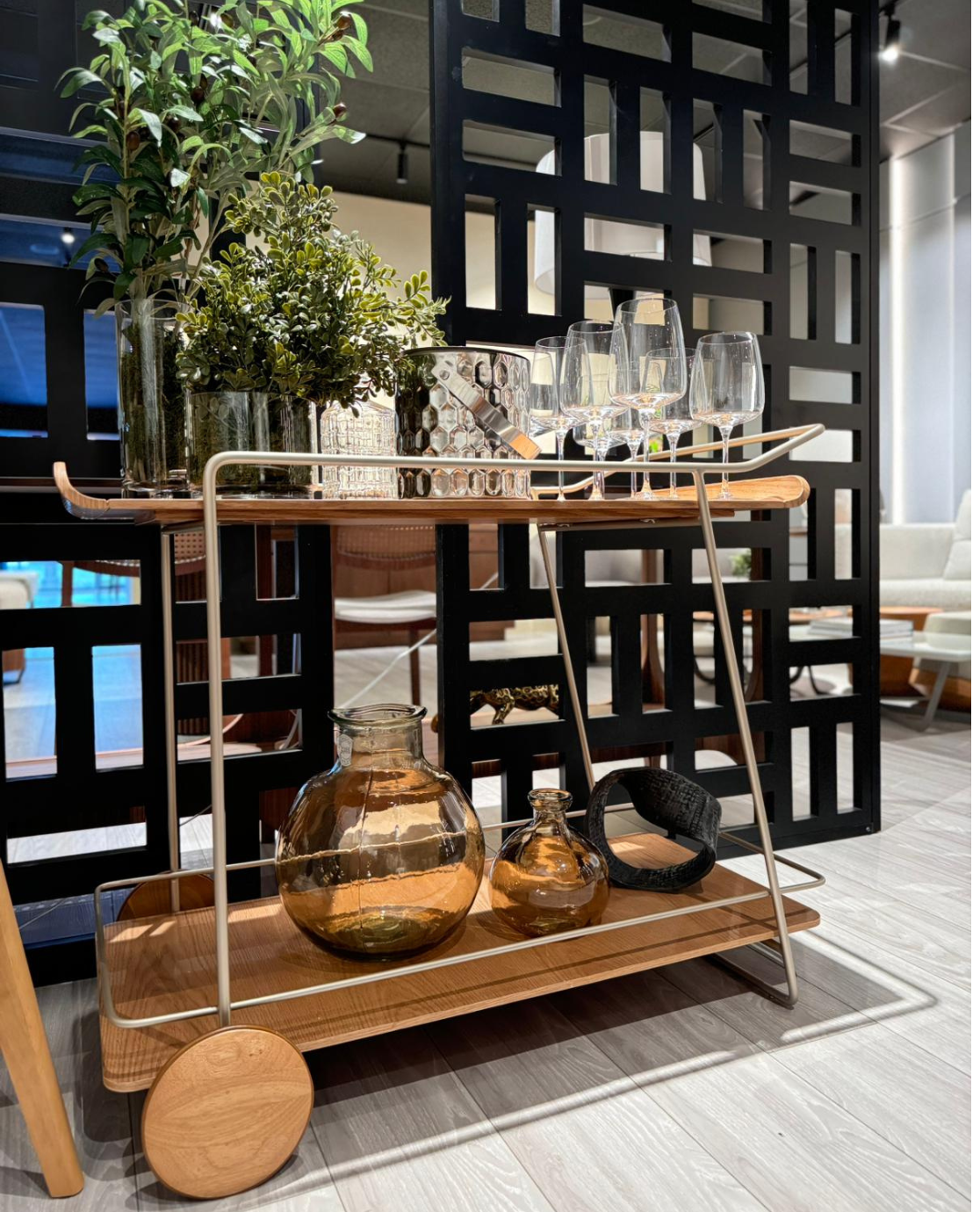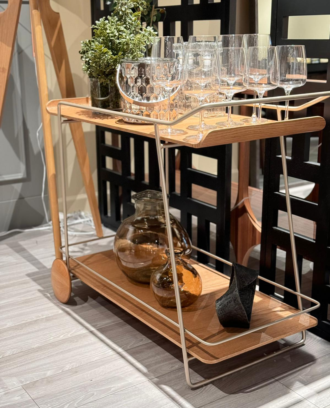 The Yet Bar Cart offers an effortless solution for bringing a touch of luxury to any home. Crafted from wood, microtextured carbon steel, and rolling wheels, it provides an exquisite foundation for any home bar. Sleek, sophisticated, and timeless, this bar cart lends a touch of sophistication and refinement to any room.