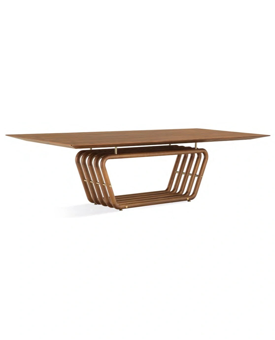 The Ducto Dining Table boasts an elegant walnut base and your choice of a brass or glass top finish. Crafted with a solid wood base and MDF veneer top, it also features brass details for added sophistication. Elevate your dining experience with this luxurious and exclusive piece.